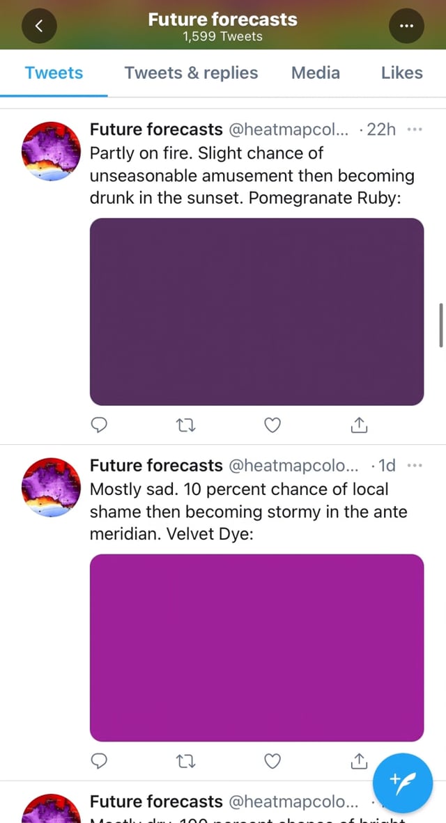 Future forecasts, @heatmapcolours, is a live Twitter bot that algorithmically generates nonsensical forecasts using words related to emotions that extreme weather can trigger. Referencing the deep pink and purple hues added to the Bureau of Meteorology’s heatmap in 2013 to represent unprecedented temperatures, the tweets are accompanied with their own invented colour swatch.