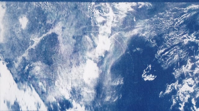 “In response to the 2019/2020 bushfires on the east coast of Australia, Raupach takes the satellite footage of the bushfire smoke and uses the cyanotype photographic process to reproduce each frame, before reanimating to produce the video work, Satellite Cyanotypes. The cyanotype solution transforms the paper into a UV sensitive negative, causing everywhere sunlight touches to turn blue while the masked paper remains white. In large bushfires, UV light is blocked by the smoke and appears as irregular patches on the BOM’s UV forecast maps. By using the cyanotype process Raupach mimics the real phenomena that Satellite Cyanotypes represents.”